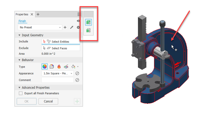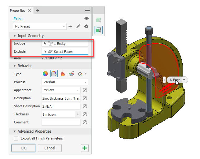 A Finish paranccsal egyszerűen vezérelhető az alkatrészek és összeállítások megjelenése, valamint gyártási utasításokat adhatunk meg, például az anyagtulajdonságot vagy a felületkezelést. Ebben a parancsban került továbbfejlesztésre a kiválasztási múvelet, mivel rendelkezésre áll most már az Include és Exclude opció, amikkel tetszőlegesen testreszabhatjuk a kiválasztási halmazt akár felületekre bontva.