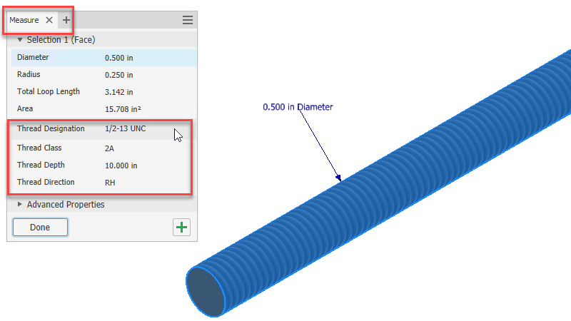 A Measure parancs használatakor a menetadatok mostantól elérhetők mind az alkatrészekhez, mind az összeállításokhoz egyaránt. Ha egy olyan felület van kiválasztva egy modellben, amelyhez menetadatok tartoznak, akkor a program a következő információkat jeleníti meg: