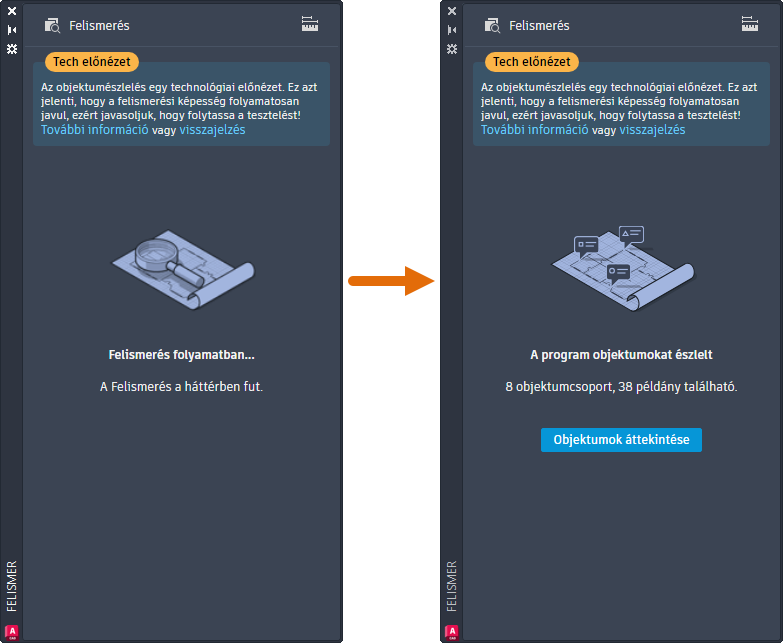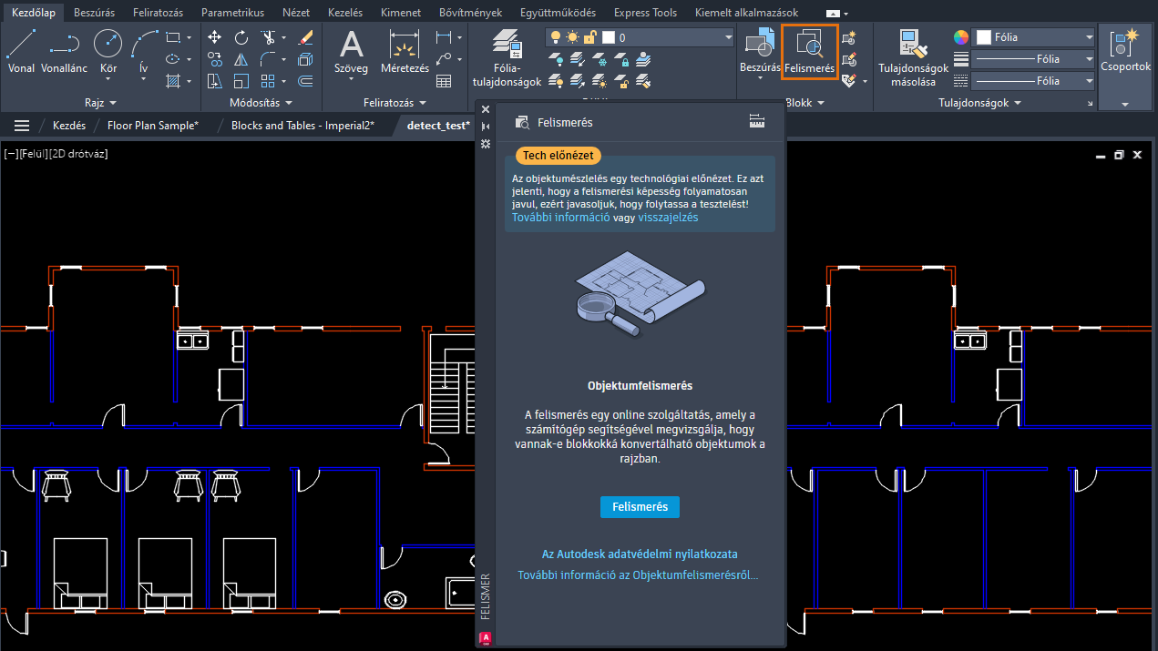 Az objektumfelismerés indításakor a program felismerés céljából elküldi a rajz geometriáját az AutoCAD gépi tanulási szolgáltatásának. Amint a szolgáltatás kielemezte a rajzot, a palettán megjelenik egy értesítés, ha a program blokkokká konvertálható objektumokat észlelt. Az azonosított objektumok vizsgálatához az Objektumok áttekintése gombra kell kattintanod!