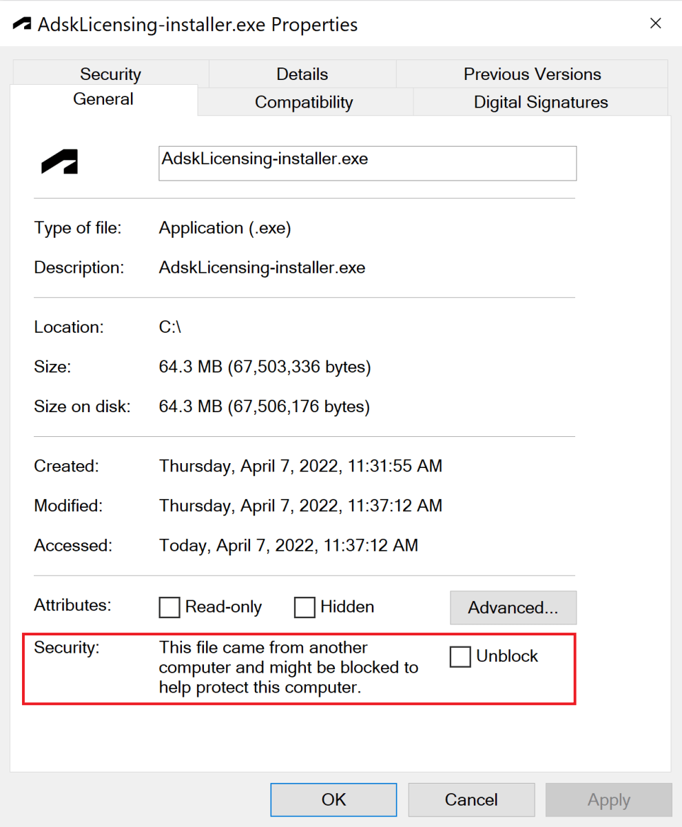 - A tulajdonságokban, az Általános (angolul General) fülön pipáld be az Unblock rublikát, ahogy a kép is mutatja